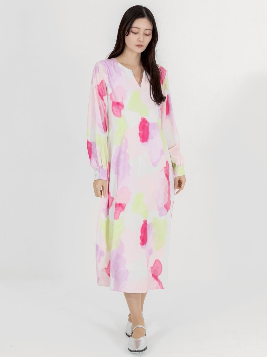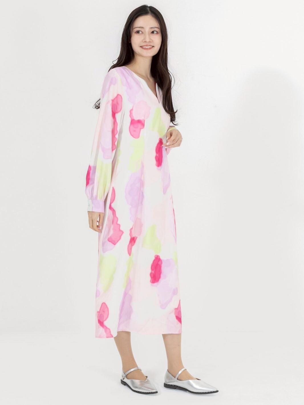 アートのような水彩柄が印象的なロング丈のワンピースです。